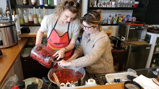 佐賀市のウクライナ料理イベントで腕を振るうアンナさん(右)=2023年4月