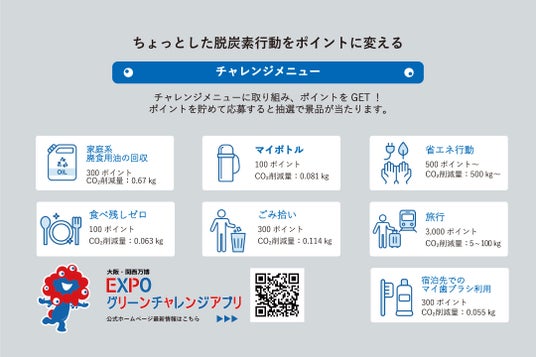 EXPOグリーンチャレンジアプリに取り組んで、みんなで大阪・関西万博に参加しよう!あなたの毎日のちょっとした行動でポイントがどんどん貯まる! ~日常生活に脱炭素とワクワクを~