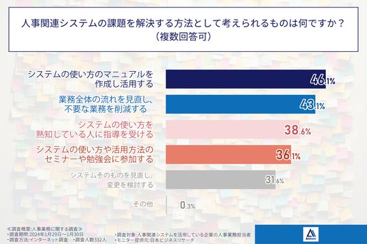 最も回答を集めたのは「システムの使い方のマニュアルを作成し活用する(46.0%)」、次いで僅差で「業務全体の流れを見直し、不要な業務を削減する(43.0%)」、「システムの使い方を熟知している人に指導を受ける(38.5%)」という結果になりました。