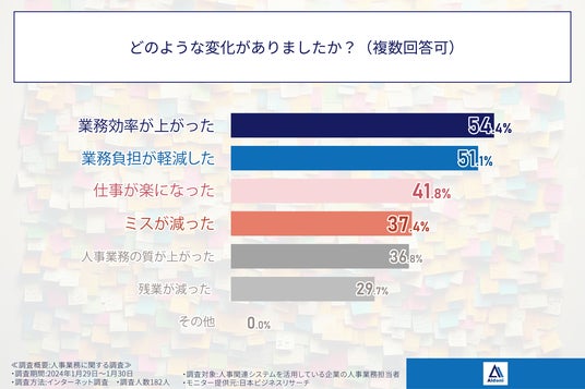 次いで、「仕事が楽になった」「ミスが減った」「人事業務の質が上がった」など、さまざまな変化に関する声が集まりました。
