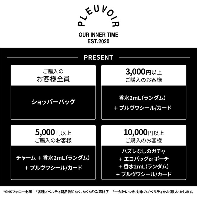 4.10,000円以上(税込)購入:はずれなしガチャ+エコバッグorポーチ+香水2mL贈呈(ランダム)+プルヴワシール/カード(ハガキ)贈呈
