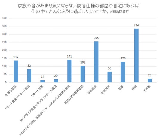 家族の音があまり気にならない防音仕様の部屋があれば、「睡眠」「音楽鑑賞」「動画鑑賞」「仕事や勉強」をしたいという結果に。