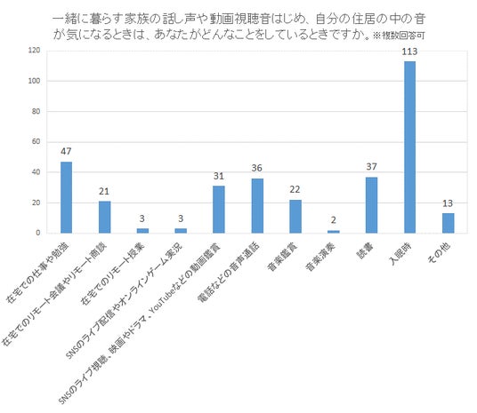 ■一緒に暮らす家族の話し声や動画視聴音はじめ、自分の住居の中の音が気になるときはどんなときかという設問では、「入眠時」が圧倒的に多く、次いで「在宅での仕事や勉強」「読書」「電話などの音声通話」という結果に。