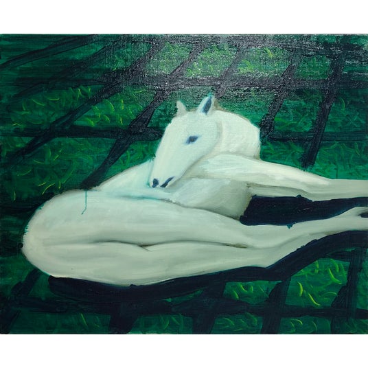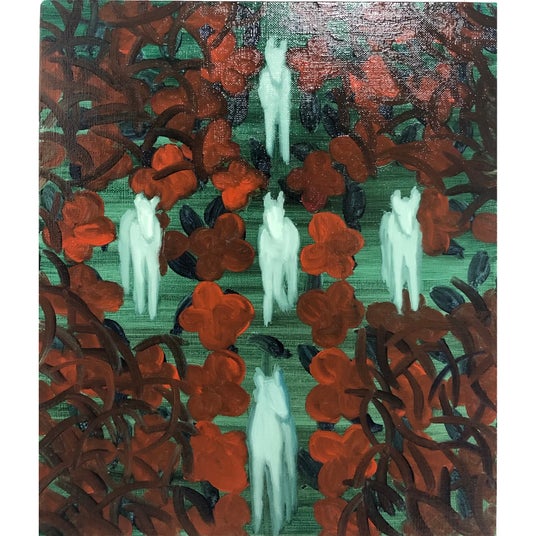 今回の展示の作品はほとんどがニコラ・プッサンの風景画をモチーフに描いています。彼の作品を見ていると、自分の幼い頃に体験した、暗い部屋の窓から山の色の光が入ってきて部屋全体が薄っすら緑色になった光景を思い出します。なので彼の風景画をその山の光のように、もしくはカメラオブスクラによって壁に映し出された光としてみたて、その光をなぞるように描きました。カメラオブスクラとは暗い部屋の小さな穴から壁に外の光景が映し出される装置です。目が見える原理もその装置と同じで、光が眼底に映し出されています。描いている最中にそのことが頭の中をよぎり、だんだんと目の中の壁にその光を描いているように感じました。去年以下のようなステートメントを描きました。「狭い場所を出て広い所に行きたいと思っていましたが、身体が邪魔だと感じました。森の中を迷うにも、広い海の上で漂うにも身体が傷つくことを気にしてしまう。そんな思い通りにいかない体にうんざりしていたら『遠くに投げる』ことを思いつきました。体を遠くに投げたら広い平野に落ちて転がったり、広い海にポチャンと漂ったりするのではないだろうかと考えました。投げられた身体が徐々に塵になって、目という澄んだレンズだけが残って、光を収集し、収集したそれらが星となって消える前に絵という墓に納めています。」今回の展示と制作はこの続きをしています。