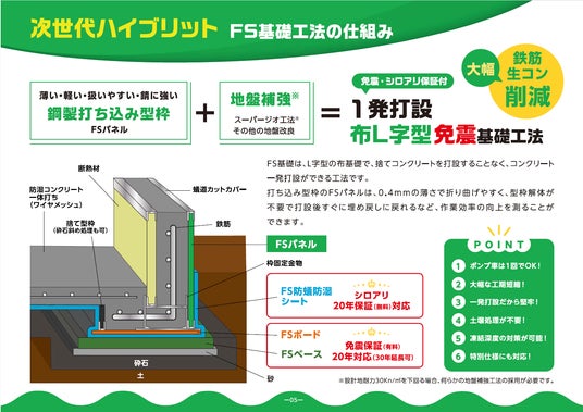 ◎免震保証と白アリ保証による安心の提供: 「FS基礎工法」は地震の揺れを建物に伝わりにくくする免震効果が期待できます。さらに、独自の免震保証制度を付帯することで、万が一の地震による損害に対し、一定の保証を提供し、お客様に安心をお届けします。