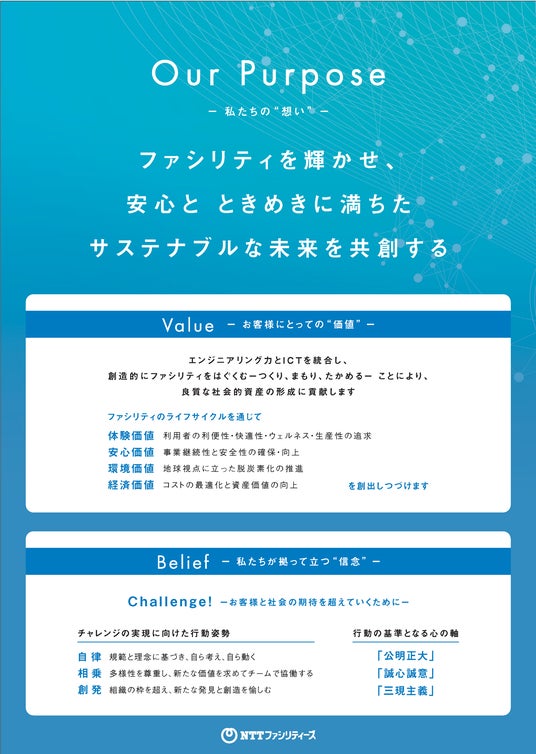 株式会社NTTファシリティーズ(本社:東京都港区 代表取締役社長 松原 和彦 以下、NTTファシリティーズ)は、「企業としての在り方・存在意義」を表明した自社のパーパス『Our Purpose』を策定しました。