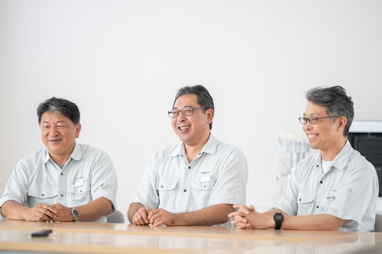 地元出身者の多い強みを生かしたチームワークから生まれる製品について「自信を持ってお届けします」と話す牧工場長、宮島次長、大谷専任課長。