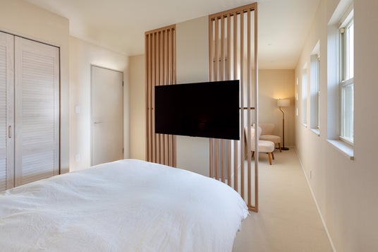 2階MAIN BEDROOM 優しい色味の空間とすることで、海と空を感じゆったりできる寝室です。(C)白井晴幸
