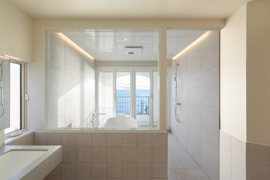 2階洗面・バスルーム 海を一望でき、海に浮かぶ船のような独立した置型バスタブが外との一体感を生み出します。(C)白井晴幸