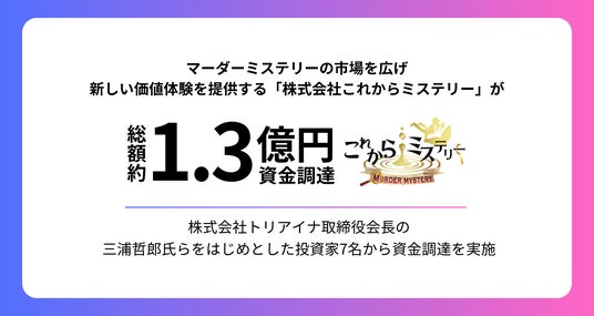 マーダーミステリーの事業を展開する株式会社これからミステリー(本社:東京都渋谷区、代表取締役:飯田祐基、以下これからミステリー)は、株式会社トリアイナ取締役会長三浦哲郎をはじめとした7名の投資家からの第三者割当増資により、総額約1.3億円の資金調達を実施しました。今回の調達により、体験型ゲーム「マーダーミステリー」を軸とした事業を通じて、マーダーミステリーを日本にも普及させ、新たなエンタメ文化の創造、そして人々がコミュニケーションできる新たな場所の提供を目指します。