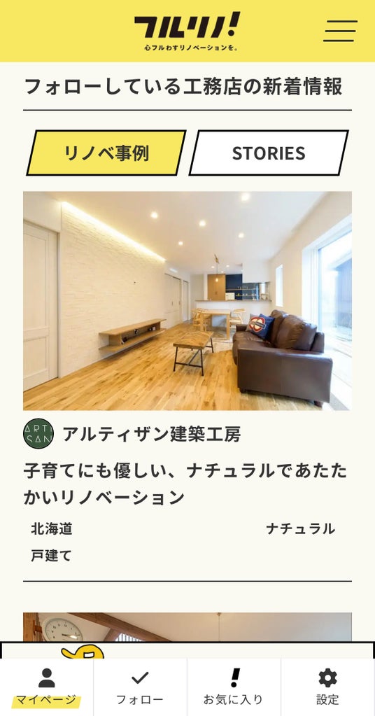 ユーザーは、無料で会員登録をすることができ、登録をすると、サイトに掲載しているリノベーション事業者のフォローや、気に入ったリノベーション事例、記事の保存、LINEでの相談などができます。