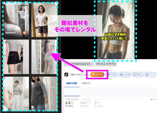 動画広告分析Proチームが、収集した広告から類似する動画素材をリスト化。気になる広告の「素材取得」をクリックし希望の素材を選択いただくと、BUZZMATEのページに遷移し、即日で素材をレンタルすることができます。