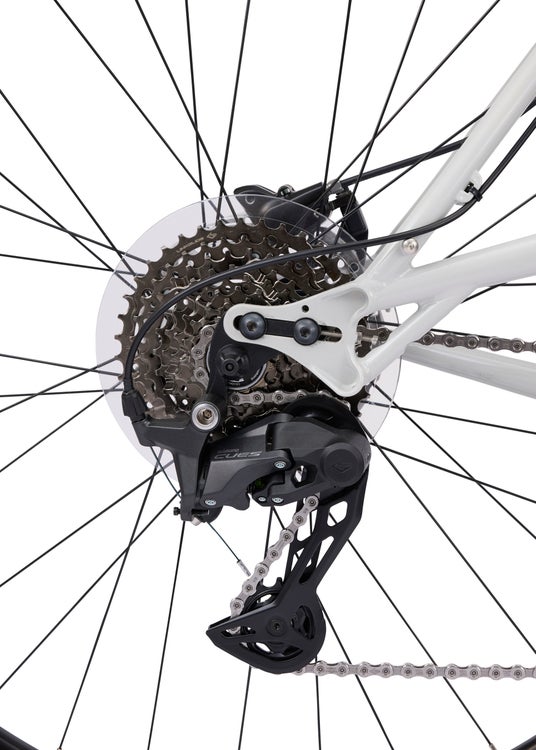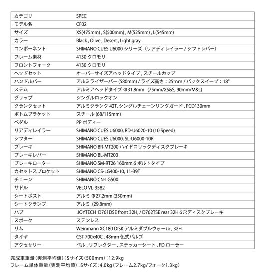 自転車の駆動の要になるコンポーネント(変速機・クランク・シフター・ブレーキ)には SHIMANO の新グレード「CUES U6000シリーズ10スピード」を採用してます。SHIMANO コンポーネントの最新スペックである「CUSE」は、幅広い自転車スタイルに対応するミドルクラス。幅広い自転車スタイルに対応する汎用性、耐久性の高い設計により快適な乗り心地を提供してくれる、CF02のコンセプトにもマッチしたスペックになります。