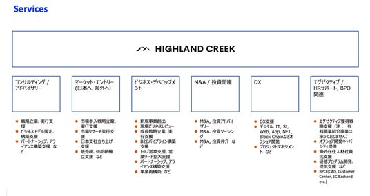 Highland Creekでは、6つのプロフェッショナルサービスを提供しています。コンサルティング・アドバイザリーサービスでは、外資系企業、上場企業、スタートアップ、数多くのコンサルティング経験と事業会社の代表取締役としての経験を組み合わせた、実効性と現実性のあるコンサルティング、助言、顧問業務を提供しています。