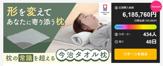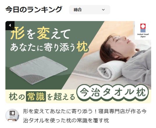 当社が開発した「枕の常識を超える今治タオル枕」は、2026年2月25日より応援購入サイトMakuakeにて先行発売を開始しました。プロジェクト開始からわずか2分で目標金額を達成し、初日を終えた段階でMakuake総合ランキング「4位」を獲得しました。