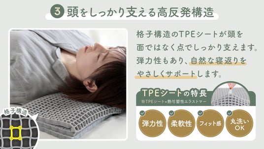 TPEは、やわらかさと弾力性をあわせ持つ素材で、頭をのせたときにはほどよくフィットしつつ、寝返りもスムーズに行いやすいという特長があります。