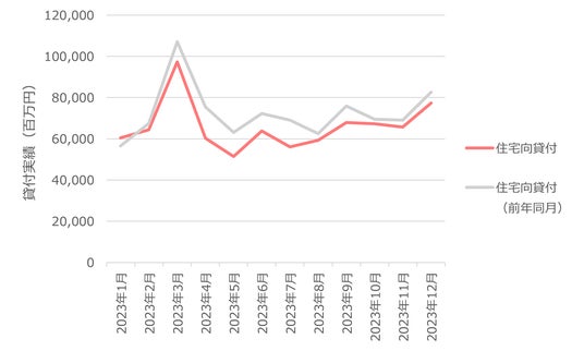 ・住宅向け貸付の月間貸付金額は、2023年11月~12月は17.7%増加。2023年も2022年と同様のトレンドをたどり、前年同月期比較でも同程度の貸付金額で着地しました。