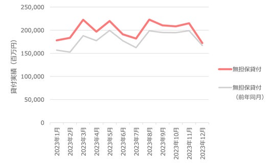 ・無担保貸付の月間貸付金額に関しては、2023年11月~12月は19.9%の減少となり同年前月期と同程度の貸付残高で着地。