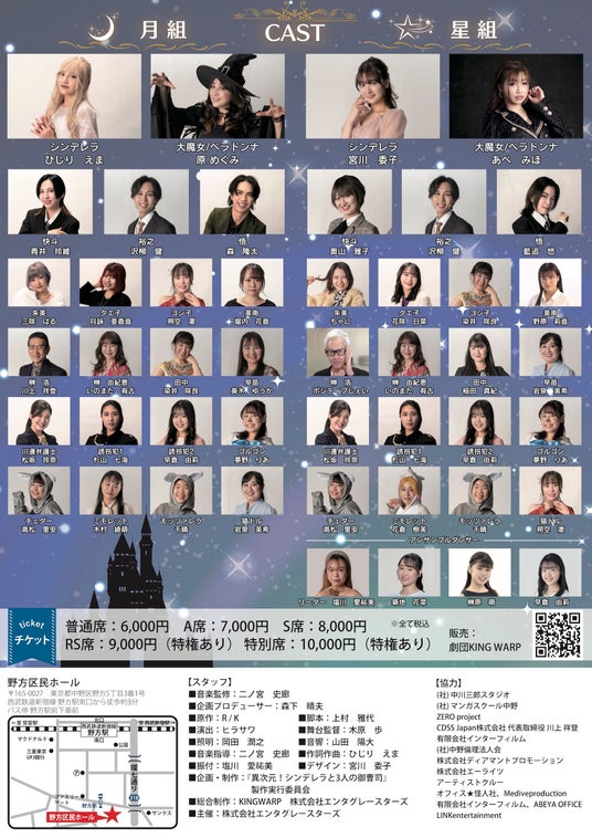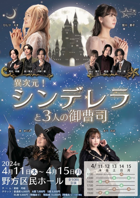 劇団KING WARP総合制作、 株式会社エンターグレースターズ(東京都中野区中野4丁目10-2中野セントラルパークサウス2F、代表取締役:清水 郁郎)主催のミュージカル、『異次元!シンデレラと3人の御曹司』が、2024年4月11日(木)~2024年4月15日(月)に野方区民ホール(東京都中野区野方5丁目3番1号)にて上演されます。