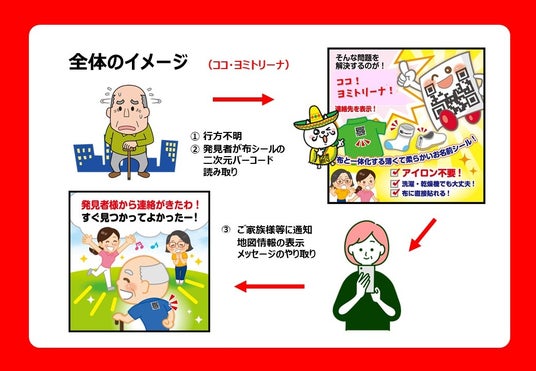 1シート56枚で、衣服や靴、肌着に直接貼れて、行方不明になった場合発見者は二次元バーコードを読み取ると、位置情報が分かり、登録いただいたご家族にメッセージや電話で連絡が取ることが可能で、最寄りの警察の連絡先が表示されて連絡ができる仕組みとなっています。