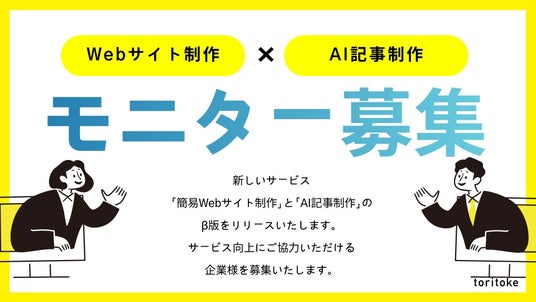 中小企業や小規模事業主向けのマーケティング支援を行っている株式会社toritoke(長野県松本市、代表取締役:宮本将弘)は、2024年9月1日より中小企業やサービスの立ち上げを行う企業向けに特化した「AI×編集による記事制作サービス」と「簡易Webサイト制作サービス」の検討に伴い、モニター企業の募集を開始しました。