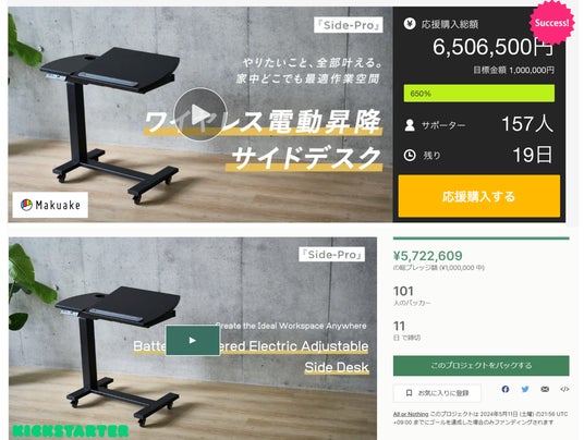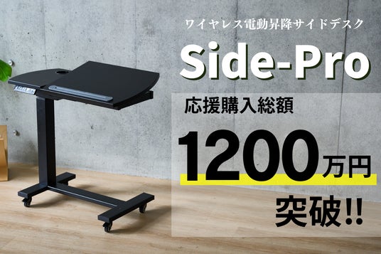 RB株式会社(東京都江戸川区、代表取締役社長:エカブス タリントン)は、ワイヤレスで見た目がスッキリとしたサイドデスク『Side-Pro』の販売を開始し、支援金総額1200万円を突破しました。Makuakeで650万円、世界No.1クラウドファンディングサイト「Kickstarter」で570万円、ともに目標金額を達成いたしました。