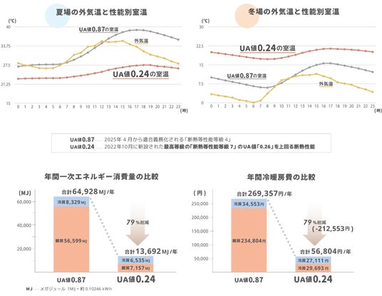 今回のモデルハウスは、省エネ断熱等級7を(6地域:UA値0.26以下)の基準をクリアしていますが、このモデルハウスを省エネ断熱等級4*(6地域:UA値0.87以下)の基準で想定した場合の「室温」と「冷暖房費(電気代)」の比較シミュレーションを実施しています。