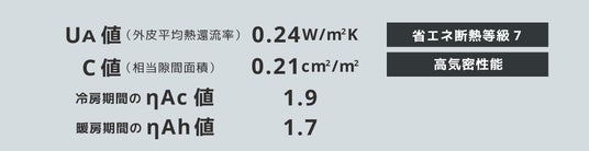 「都筑モデルハウス」は、2022年10月1日に新設された戸建て住宅の住宅性能表示制度(断熱等性能等級6・7)の基準(外皮平均熱貫流率 UA値:0.26、ηAC値:2.8)を上回る住宅性能を備えています。