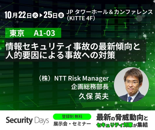 株式会社NTT Risk Manager(以下「NTT Risk Manager」)は株式会社ナノオプト・メディアが2024年10月22日に開催する国内最大級のセキュリティ専門イベント「Security Days Fall 2024 Tokyo」の基調講演に登壇し、情報セキュリティ事故の最新傾向を解説します。また、人的要因による情報セキュリティ事故への対策にお悩みの皆様に対し、具体的な解決策について提言します。