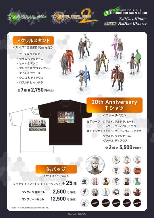株式会社アクリルコンプレックス(本社:東京都江戸川区)は、『DIGITAL DEVIL SAGA アバタール・チューナー』の発売20周年を記念したアニバーサリーグッズの予約を7月25日(木)12時より開始いたします。