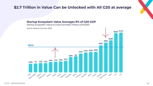 東京のスタートアップエコシステムは、近年著しい成長を遂げている一方、ユニコーン企業の創出やエコシステム全体の評価額において遅れをとっています。Startup GenomeがG20の依頼に基づき行なった調査によりますと、G20加盟国のGDPに対するエコシステム価値の平均は8%ですが、日本は1.7%に留まっており、エコシステムに成長余地があることが明らかになりました。