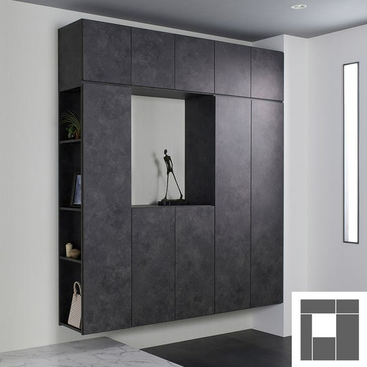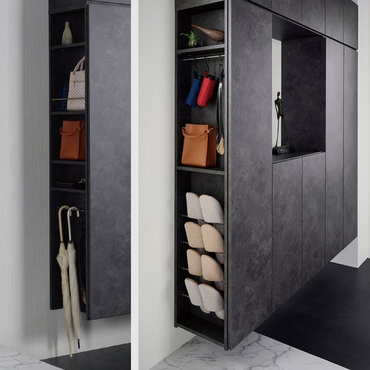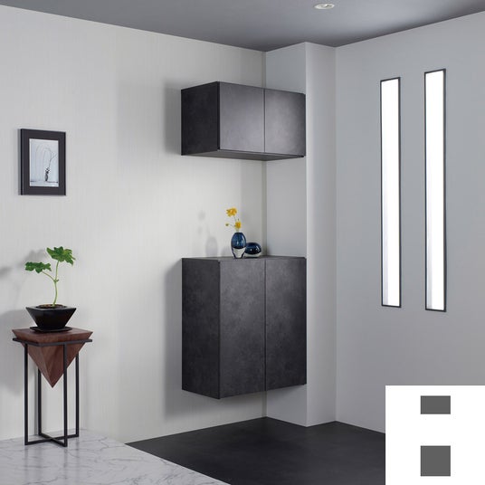 MARGINの新エントランス収納シリーズでは、BOX形状のキャビネットを壁に自由にレイアウトするように組み合わせ、スペース・用途・収納量を考慮したエントランスをお作りいただけます。