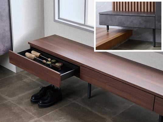 新エントランス収納では、玄関周りの細かなアイテムをまとめて収納できる引出付きのカウンターとベンチをご用意しています。カウンターは単体としても、キャビネット収納に追加しても使え、靴の脱ぎ履きがラクになるベンチには、短い脚が付属しているので上がり框(かまち)にも対応可能です。
