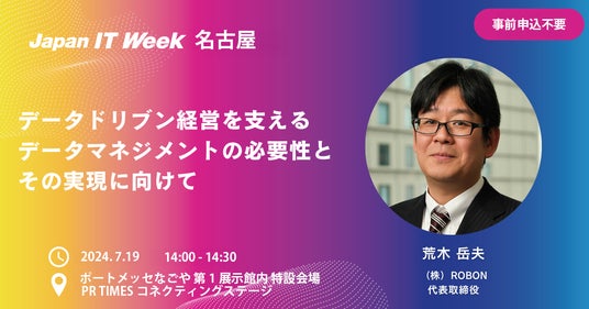 株式会社ROBON(本社:東京都新宿区、代表取締役会長:荒木 岳夫、以下当社)は、2024年7月19日(金)14時00分~ Japan IT Week【名古屋】にて開催される「PR TIMESコネクティングステージ」へ登壇いたします。当社代表の荒木が、「データドリブン経営を支えるデータマネジメントの必要性とその実現に向けて」をテーマに講演いたします。