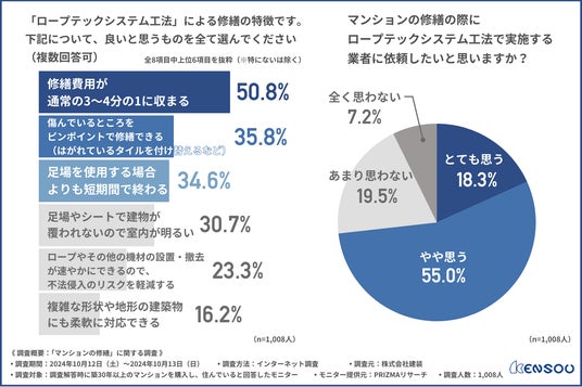 株式会社建装が提供する、「ロープテックシステム工法(R)」についての利点として、修繕が通常より低予算で実施可能な点が最多となりました。修繕費用が高いと感じている方が6割近くいる結果からも、修繕費用が抑えられることは魅力的なことが示唆されました。