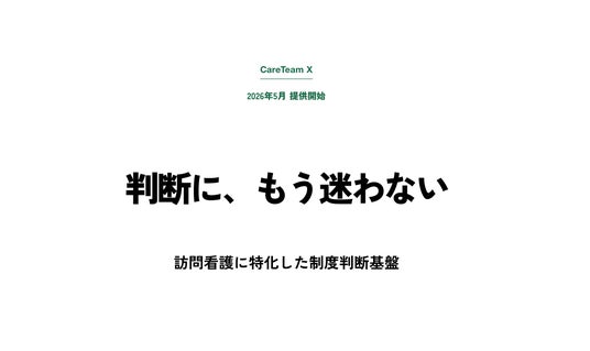 株式会社雲紙舎(東京都台東区、代表取締役:長屋好則)は、訪問看護に特化した制度判断基盤「ケアチームX」を発表しました。2026年5月より、訪問看護特化のレセプト代行サービス「ケアチーム」の既存顧客向けに、段階的な提供を開始する予定です。