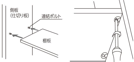 ※棚板を側板(仕切り板)に付いている連結ボルトに対して横にスライドさせ取り付け、ドライバーで締め付けて固定。