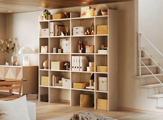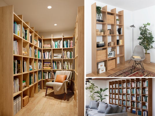 収納に必要な分だけ板を連結していくことで、リビングから洗面室、書斎、趣味の部屋、ホール一面の本棚など設置場所や使い方は様々に対応できます。また、市販のカゴや箱を組み合わせれば、収納する物や量の変化にも対応できるため、ライフスタイルに合わせて長く使える収納を実現することができます。
