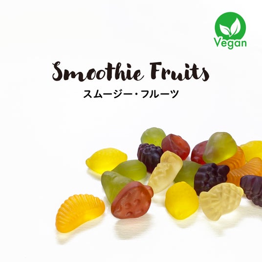 Smoothie Fruits スムージーフルーツヴィーガントップセールスのグミ。小さな果実は果汁14%! チューイングキャンディのような口当たり、後味はすっきりとした果実味。2つ3つ同時に食べてスムージー感覚をぜひ!口の中で温めて、ゆっくりお楽しみください。