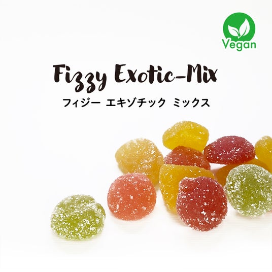 Fizzy Exotic-Mix フィジーエキゾチックミックス口に入れるとシャリシャリ甘酸っぱい!果汁入りのフルーティでソフトな食感。南国フルーツを優しい味に仕上げたおすすめヴィーガングミ。子供さんにも大人気!