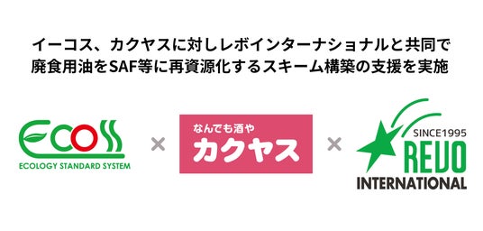 この度イーコスは、株式会社カクヤスグループ(本社:東京都北区、代表取締役:前垣内洋行、以下:カクヤスグループ)、カクヤスグループの子会社である株式会社カクヤス(本社:東京都北区、代表取締役:佐藤順一、以下:カクヤス)に対し、株式会社レボインターナショナル(本社: 京都府京都市下京区、代表取締役CEO: 越川 哲也、以下:レボインターナショナル)と共同で、飲食店および家庭から出される廃食用油をSAF(持続可能な航空燃料Sustainable Aviation Fuel)等に再資源化するスキームの構築支援を行いました。