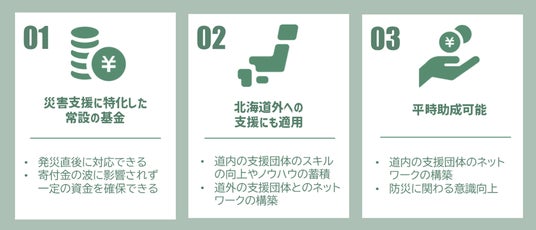 北海道災害復興支援基金は、NPOによる平時・災害時の長期的な支援活動を保障することによって、北海道の持続的な災害復興を支援することを目的に、北海道NPOファンドにより2020年に造成された基金です。