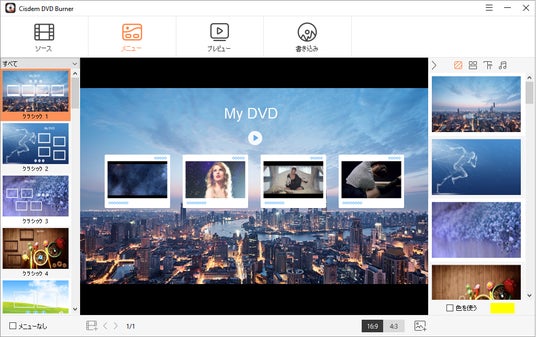 4. 個性的なDVDメニューを作成します。「メニュー」タブで左サイドバーから好きなDVDメニューのテンプレートを選択します。また、右サイドバーで背景画像を変更したり、BGMをインポートしたり、テキストを挿入したりできます。