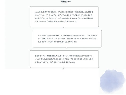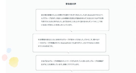 ホームページのリニューアルに際し、「セルフヘルプグループのプラットフォーム wreath(リース)」をご利用いただいている方々からお声を頂戴しました。どのようなプラットフォームなのか十分に周知できていないなかで、実際にお使いいただいている方々のお声から広く関心を寄せていただくきっかけとなりましたら幸いです。ご協力いただきました皆様に心よりお礼申し上げます。