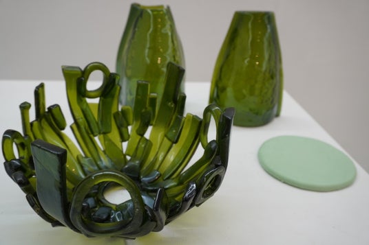 2か月の制作期間の間、透明なガラスもある温度以上で熱すると失透してしまうこと、同じボトルのガラスでも失透したものと失透していないものを熔かし合わせると割れてしまう事、ボトルの形状をデザインに活かせることなど、学生たちはそれぞれの研究によって生まれたアイディアと発見をもとに、自身の作品作りに繋げていきました。
