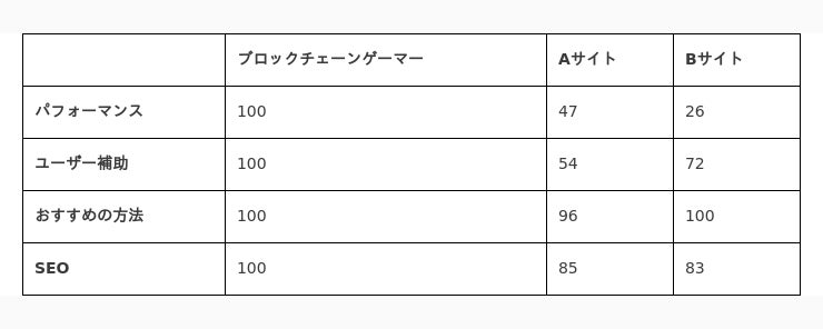 ブロックチェーンゲーマーは、PageSeed Insightsの指標において、すべて100点を記録しています。ユーザーが求める情報にいち早く辿り着けるよう努めています。