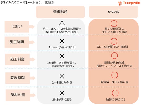 汚れた壁や天井を貼り替えず新品同様に再生する特許商品「e-coat」を全国展開する株式会社ワイズコーポレーション(本社:東京都新宿区、代表取締役:染谷 康宏)では、企業のお盆休みを前に、e-coatの依頼件数が通常の2倍まで増加しています。出社回帰でオフィス賃料が上昇し、オフィス環境の改善に取り組みたくても実行できない企業の新たな選択肢として、e-coatが注目されています。