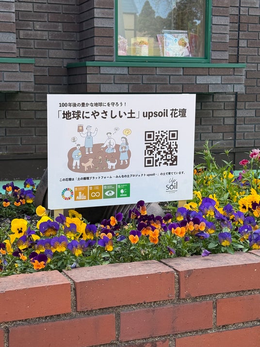 のご協力のもと、upsoil花壇に「地球にやさしい土 upsoil花壇とQRコード」と記した看板も設置しました。この看板を通じて、来場者に花壇の背景や環境メッセージが伝わる仕掛けを整えています。