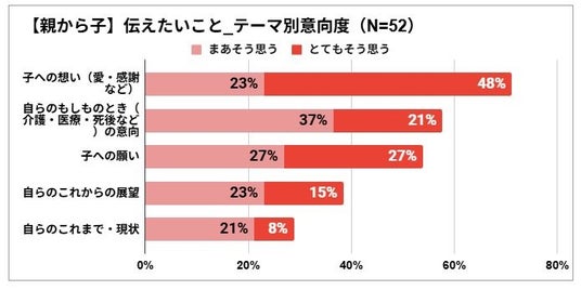 本調査では、子の65%に「親に伝えられていないけれど、伝えたいこと」があり、第1位は「愛・感謝」であること。76%に「親に聞きたいけれど聞けていないこと」があり、第1位は「もしものとき(介護・医療・死後など)の意向」であることがわかりました。