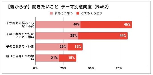 - <親から子>へ聞きたいことの第1位は「不安・悩み・心配」で86%、2位は僅差で「これからの願い」で82%